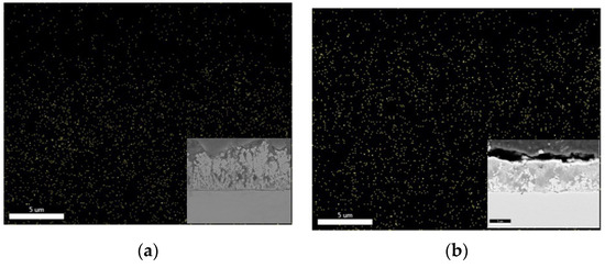 The distribution of Ce particles was quite homogenous, as shown in Figure 13 by the cross-section EDS mapping for samples deposited under ultrasound from two different solutions: 0.2 wt.% CeO2 powder (Figure 13a) and 0.2 wt.% CeO2 sol (Figure 13b) deposited at 2 A dm−2. The greater amount of Ce particles, homogenously distributed, could be observed when ceria sol was used as the particle source, which is in agreement with the results shown in Figure 9b.