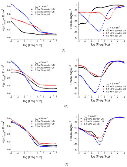 Bode plots of Zn-Co-CeO2 composite coatings deposited under ultrasound: influence of different deposition current densities: (a) 1 A dm−2, (b) 2 A dm−2, and (c) 5 A dm−2 and ceria sources on corrosion properties.