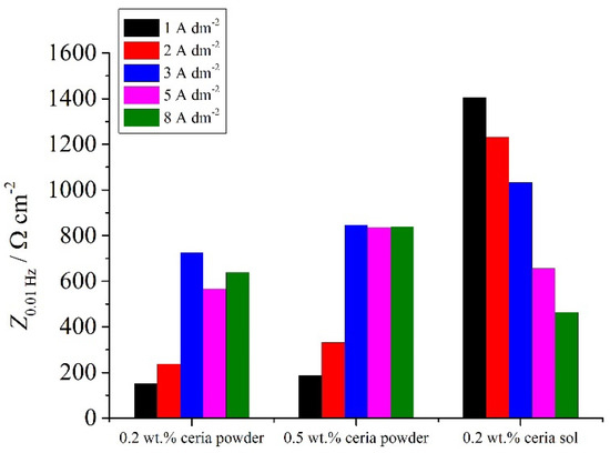 The impedance modulus values at low frequencies can be ascribed to processes occurring on the steel/electrolyte interface where corrosion occurs [45,46,47,48,49] and can be used as effective tool for determining the corrosion resistance properties of the system. The values of the low-frequency impedance modulus (Figure 15) of the Zn-Co-CeO2 and sol-derived coatings at 1–3 A dm−2 were higher than for the powder-containing particles. It is worth mentioning that the Z0.01Hz values for Zn-Co alloys were around 114 Ω cm−2 for Zn-Co deposited under magnetic stirring and 150 Ω cm−2 for the alloy obtained under ultrasound power.