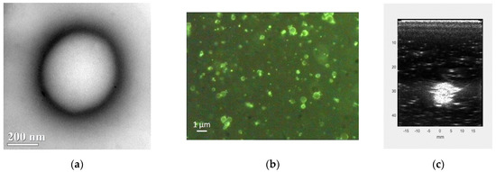 Due to their dimensions and physical characteristics, the morphology of the above nanostructures can be investigated by transmission electron microscopy (TEM) (Figure 2a), fluorescent microscopy provided an FITC-labeled shell has been applied (Figure 2b) and, especially for OLNBs, by US (Figure 2c).