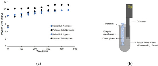 Examples of passive oxygen release in fluids: (a) oxygen concentration in different liquids, saline and Perfadex, in normoxic and hypoxic bulk at 4 °C; (b) illustration of the device for measuring oxygen diffusion from the donor compartment to the bathing medium. Data were measured with accuracy of ±1.5% of the nominal value.