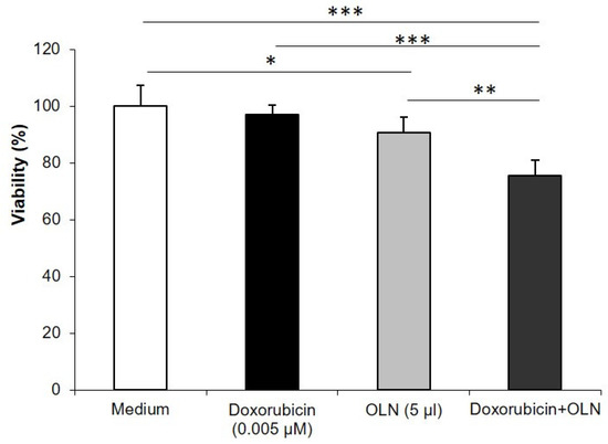 DOX in OLND promotes synergistic antitumor effects. Cell viability was evaluated by MTT assay. Data are expressed as percentage vs. control. TUBO cells were left untreated or incubated for 48 h with DOX (0.005 μM), OLNDs (2.5% v/v) or DOX-loaded OLNDs (0.005 μM/2.5% v/v). Results are shown as means ± SD from three independent experiments. Significance of the differences: * p < 0.05; ** p < 0.005; *** p < 0.001.
