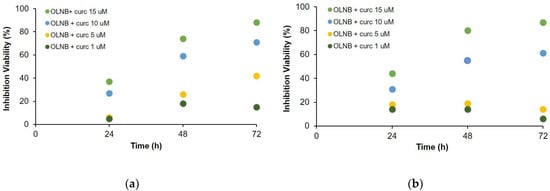 Another formulation based on the association of dextran sulfate-shelled OLNBs and curcuminoids (Curc) was shown to be effective in vitro against prostate cancer cells. The inhibition of the viability of PC-3 and DU-154 tumor cells is greatly improved when Curc is delivered by OLNBs at all doses (see Figure 5). Moreover, other important inhibitory effects of Curc-loaded OLNBs on cell motility and adhesivity were detected [32].