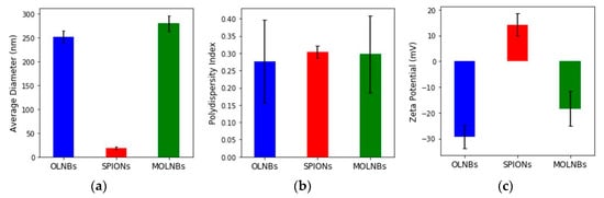 Physicochemical characteristics of nanocarrier formulations: (a) average diameter (nm); (b) polydispersity index; (c) ζ potential (mV) for OLNBs (blue), SPIONs (red) and MOLNBs (green).