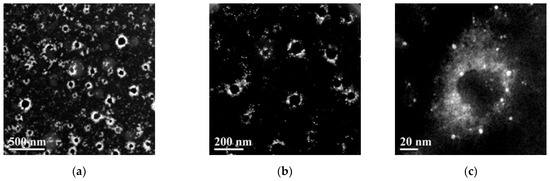 HAADF-STEM images of the MOLNBs decorated with SPIONs taken at different magnifications ((a) = 500 nm, (b) = 200 nm, (c) = 20 nm).