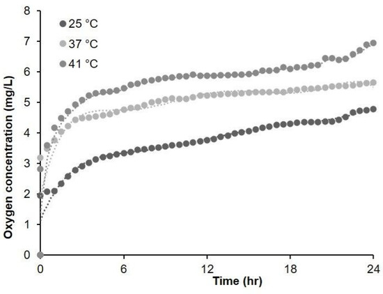 Oxygen release study performed by passive diffusion in saline solution at different temperatures over 24 h. Data of oxygen concentration were measured with accuracy of ±1.5% of the nominal value.