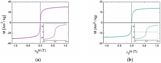 In Figure 10a, the magnetization cycle of SPIONs is reported. It showed a superparamagnetic behavior, with a magnetization value of 30 Am2/kg at the maximum applied field μ0H = 1.8 T.