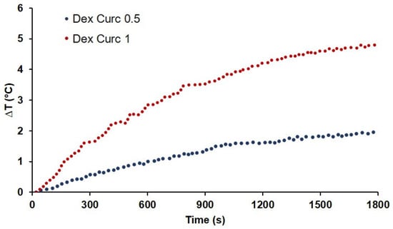 Magnetic hyperthermia measurements under an alternating (f = 429 kHz) magnetic field of 300 Oe for 30 min: temperature increase as a function of time of the curcumin-loaded dextran MOLNBs at different concentrations of SPIONs (1 mg/mL and 0.5 mg/mL).