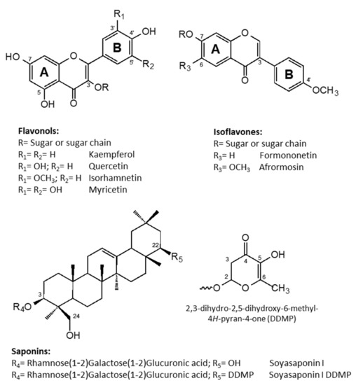 - Kudou, S.; Tonomura, M.; Tsukamoto, C.; Uchida, T.; Sakabe, T.; Tamura, N.; Okubo, K. Isolation and Structural Elucidation of DDMP-Conjugated Soyasaponins as Genuine Saponins from Soybean Seeds. Biosci. Biotech. Biochem. 1993, 57, 546–550. [Google Scholar] [CrossRef]