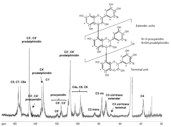 - Thompson, D.; Pizzi, A. Simple 13C-NMR methods for quantitative determinations of polyflavonoid tannin characteristics. J. Appl. Polym. Sci. 1995, 55, 107–112. [Google Scholar] [CrossRef]