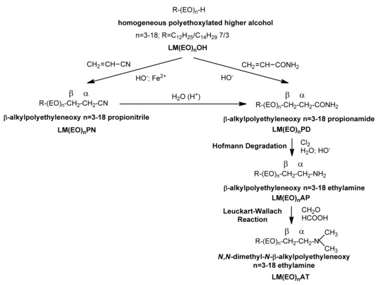 Conventional N-alkylation (including methylation) with alkyl halides, O-alkylation and/or S-alkylation have also benefited from the competencies of phase-transfer catalysis [13,14,15], allowing the unfolding of processes with increased yields in aqueous media, even without the exclusive participation of strong Lewis bases. Protonation of the amphionic intermediate (Figure 1C) takes place at the interface separating the organic phase from the aqueous one, but not exclusively. The most accessed phase-transfer catalysts cited in the literature have been N,N,N-tricapryl-N-methylammonium chloride, N,N,N,N-tetrabutylammonium chloride, and N,N,N-triethyl-N-benzylammonium chloride. Soluble in both phases, they transfer the low energy carbenium-onium cation with positive charge delocalized in both directions. Among the most publicized examples, we mention aliphatic amines as such, aromatic, or mixed: hydrazobenzene, phenylhydrazone, diazoamine derivatives, and nitrogen heterocycles (pyrrole, pyrrolidone, pyrazole, imidazole, benzimidazole, substituted aziridines, isoxazolones, pyridines, morpholine, indole, benzotriazole, carbazole, etc.) [3,16]. In essence, although steady progress has been made over the last century in understanding the specificity and mechanism of the reductive alkylation (methylation) process, it can be stated with certainty that the interest was focused on aliphatic, aromatic, and heterocyclic primary amines as such or mixed, lower or medium, while in the category of aldehydes, the lower/middle homologues of the series were studied primarily. The consulted literature does not report studies on higher primary/secondary amines or homogeneous higher primary/secondary polyether alkyl amines (with a strictly defined degree of oligomerization of ethylene oxide in the polyoxyethylene chain). In this sense, the major objective of this paper is to study the dependence of reductive methylation yields in the series of homogeneous polyoxyethylene chain homologues n = 3, 6, 9, 12, 18 (Figure 2) of homogeneous primary β-lauryl/myristyl 7/3 polyethyleneoxy n = 3–18 ethylamines, LM(EO)nAP, obtained by cyanoethylation or amidoethylation, i.e., nucleophilic addition under basic catalysis of homogeneous lauryl/myristyl 7/3 polyethyleneoxy n = 3, 6, 9, 12, 18 alcohols, LM(EO)nOH, [17,18] to acrylonitrile or acrylamide monomers, respectively (Figure 2) [19,20,21,22,23], followed by the partial hydrolysis of homogeneous β-lauryl/myristyl 7/3 polyethyleneoxy n = 3, 6, 9, 12, 18 propionitriles, LM(EO)nPN, or the Hofmann degradation of homogeneous β-lauryl/myristyl 7/3 polyethyleneoxy n = 3, 6, 9, 12, 18 propionamides, LM(EO)nPD, obtained, respectively, on the main operating parameters (temperature, molar ratio of reactants, reaction time, phase-transfer catalysis).