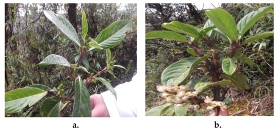 The genus Hedyosmum can be found in the form of trees or shrubs, with branches bulging or hinged at the height of the nodes. Its leaves are simple, opposite, toothed, and petiolate with pinnate veins [8]. When the foliage is crushed, it becomes strongly aromatic; indeed, the genus name finds its origin in the Greek hedy (pleasant) and osmum (smell), referring to this smell that is associated with pepper, lemon, and anise [9]. The species of the genus Hedyosmum are dioecious, and some have male and female inflorescences. The male inflorescences are arranged in the form of terminal or axial spikes, while the female inflorescences are arranged in the form of racemes or panicles (Figure 1). Individuals with male inflorescences are usually called male specimens or simply “male”; in the same way, female specimens are called “female”. The fruits are small, fleshy, and white when ripe [9]. Only the female flowers produce fruits. Figure 1 shows the tender white fruits of the female specimen (end of the flowering stage and beginning of the fruiting stage).