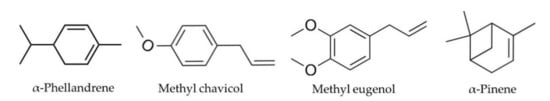 The three main chemical components of EO from H. racemosum were α-phellandrene, methyl chavicol (synonym estragole), and germacrene D, while for the EO of H. scabrum male and female specimens [11], these compounds were non-detected; however, other minor components were reported in the EO of male and female, but in different proportions: α-pinene (15% and 6.4%), linalool (16.5% and 3.3%), and methyl eugenol (1% and 0.6%). The chemical similarity of the EO of these Hedyosum species was 39.46% and 41.67% for male and female EO, respectively. Likewise, in the EO of female H. racemosum specimens, three components were identified that are not present in male EO: γ-terpinene (0.06%), germacrene-D-4-ol (0.19%), and α-amorphene (0.14%). It can be considered that the absence of chemotypes, because the majority compound (α-phellandrene), was the same in both oils.