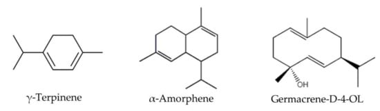 The compounds of the male EO and female EO identified using the polar column were mainly grouped into ALM with a representation of 45.82% and 43.63%, respectively. The principal compound was α-phellandrene, with 25.90 ± 1.97% in male EO and 23.90 ± 1.89% in female EO. Other main compounds were 21, 2, 34, and 30. As for the non-polar column γ-terpinene, a minority compound (<5%) was identified only in female EO. In addition, the compound germacrene-D-4-OL (Figure 3) was identified in female EO. Compounds belonging to the ARS group were not identified.