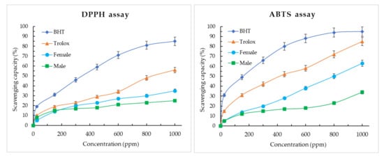 The male and female EO of H. racemosum was explored for antioxidant activity using DPPH• and ABTS•+ scavenging activity. BTH and Trolox were used as positive control and the results obtained are shown in Figure 4.
