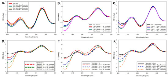 CD spectra of (A) TBA, (B) 5TG, (C) 5LTG, (D) 4NHT, (E) 13NHT and (F) 413NHT titrated with increased equivalence of 100 µM thrombin solution.