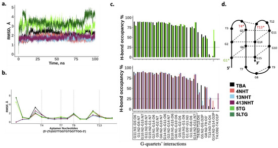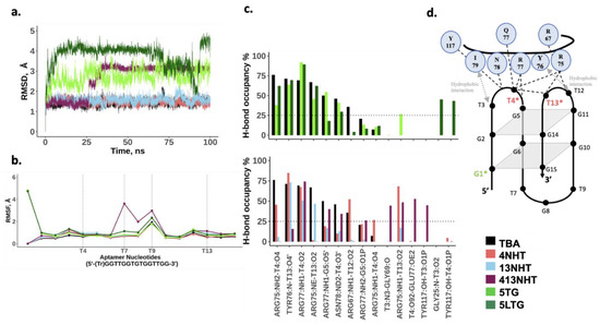 MD simulation results for the thrombin free aptamers. (a) Root mean square deviation from the initial structure; (b) Average root mean square fluctuations for each nucleotide in the native and modified aptamer. Trebler group is treated as a separate nucleotide; (c) Bond occupancies for intra-hydrogen bonds in the aptamer. Only H-bonds with at least 25% occupancies are shown (d) Schematic showing h-bond interactions within the aptamer.
