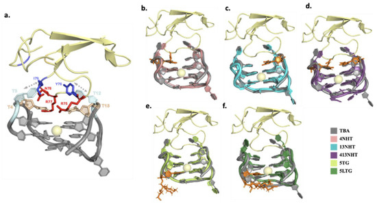 Structures of thrombin bound aptamers. The protein and the potassium ion are shown in yellow and the unmodified aptamer in gray (a) The aminoacid residues and nucleotides involved in the interaction between thrombin and the unmodified aptamer (hydrophobic interactions in shades of blue, and hydrophilic in red and wheat) (b–f) Structures of the dominant conformation from the simulations for the modified aptamer systems overlaid on the unmodified aptamer (gray). The modified nucleotides in each case are highlighted in orange.