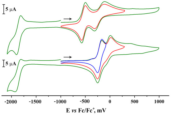 2.3. Electrochemical Study of the Complexes 1 and 2