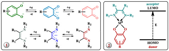 - Butin, K.P.; Beloglazkina, E.K.; Zyk, N.V. Metal complexes with non-innocent ligands. Russ. Chem. Rev. 2005, 74, 531–553. [Google Scholar] [CrossRef]