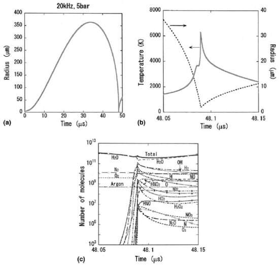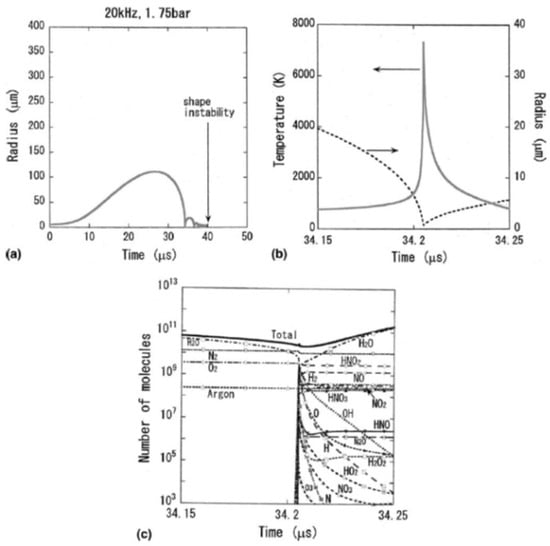 - Yasui, K.; Tuziuti, T.; Kozuka, T.; Towata, A.; Iida, Y. Relationship between the bubble temperature and main oxidant created inside an air bubble under ultrasound. J. Chem. Phys. 2007, 127, 154502. [Google Scholar] [CrossRef]