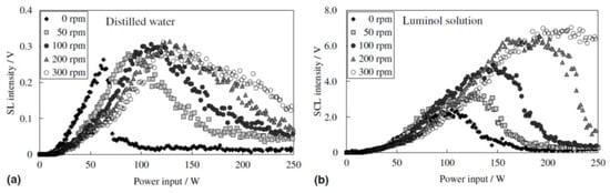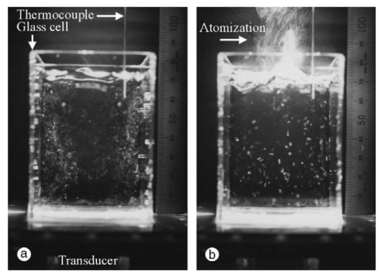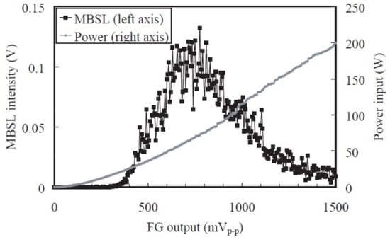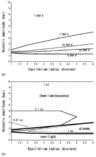 - Hatanaka, S.; Yasui, K.; Tuziuti, T.; Mitome, H. Difference in threshold between sono- and sonochemical luminescence. Jpn. J. Appl. Phys. 2000, 39, 2962–2966. [Google Scholar] [CrossRef]
