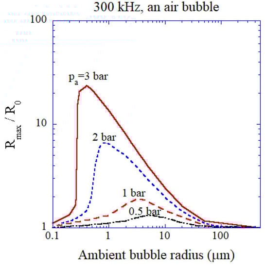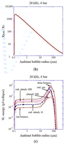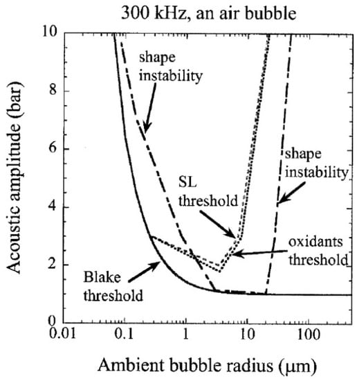 - Yasui, K.; Tuziuti, T.; Lee, J.; Kozuka, T.; Towata, A.; Iida, Y. The range of ambient radius for an active bubble in sonoluminescence and sonochemical reactions. J. Chem. Phys. 2008, 128, 184705. [Google Scholar] [CrossRef]