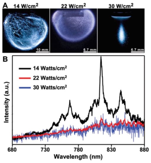 - Pflieger, R.; Lejeune, M.; Noel, C.; Belmonte, T.; Nikitenko, S.I.; Draye, M. Diagnosing the plasma formed during acoustic cavitation in [BEPip][NTf2] ionic liquid. Phys. Chem. Chem. Phys. 2019, 21, 1183–1189. [Google Scholar] [CrossRef]