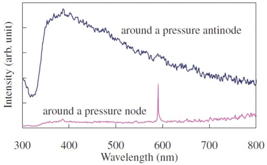 - Abe, S.; Choi, P. Spatiotemporal separation of Na-atom emission from continuum emission in sonoluminescence. Jpn. J. Appl. Phys. 2009, 48, 07GH02. [Google Scholar] [CrossRef]