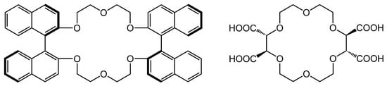 The structures of (R,R)-bis-(1,1′-binaphthyl)-22-crown-6 (left) and (+)-(18-crown-6)-2,3,11,12-tetracarboxylic acid (right).