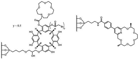 The newly synthesized aza-15-crown-5-capped (3-(C-methylcalix [4] resorcinarene)-2-hydroxypropoxy)-propylsilyl-bonded silica particles (15C5-MCR-HPS), packed into a 150 mm × 2.0 mm I.D. stainless-steel column, were successfully applied in the separation of positional isomers of disubstituted benzenes (nitroanilines and nitrophenols) and enantiomers of chiral drug compounds in HPLC under NP, RP, and PO conditions [26]. The anchored (3-(C-methylcalix [4] resorcinarene)-2-hydroxypropoxy)-propyltrimethoxysilane as a chiral selector with aza-15-crown-5 moieties (Figure 3) forms multiple interactions, providing excellent and robust separation of the enantiomers of chiral drug compounds, e.g., promethazine (RS: 7.74), 1-phenyl-1-propanol (RS: 5.78), warfarin (RS: 2.03), and α-methylbenzylamine (RS: 6.83), under RP conditions.