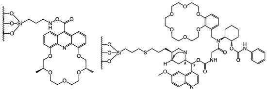 Among several newly synthesized 18-crown-6 and 21-crown-7 ether derivatives, one was selected for the preparation of a new CSP (Figure 4, left) to study its role in the enantiomeric separation of arylalkylamines and α-amino acid esters [28]. The results underlined the importance of the distance of the chiral center from the acridine ring, which was found to be decisive for the efficiency of enantiomeric recognition.