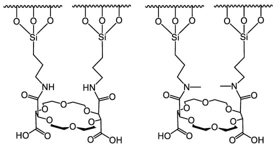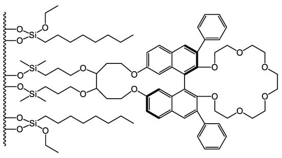 In 1979, Sogah and Cram were the first to report enantioselective separation on a crown ether-based CSP bound to a polystyrene skeleton [15]. About two decades later, Hyun and coworkers [16] and Machida et al. [17] described the synthesis and use of stationary phases based on chemically bound crown ether to separate enantiomers of compounds containing a primary amino group. Several crown ethers have been studied in recent decades; however, two types of chiral crown ethers have been utilized efficiently for the preparation of CSPs. One is derived from bis-(1,1′-binaphthyl)-22-crown-6, and the other from (18-crown-6)-2,3,11,12-tetracarboxylic acid (18-C-6-TA) [18,19,20,21]. Their structures are presented in Figure 1.