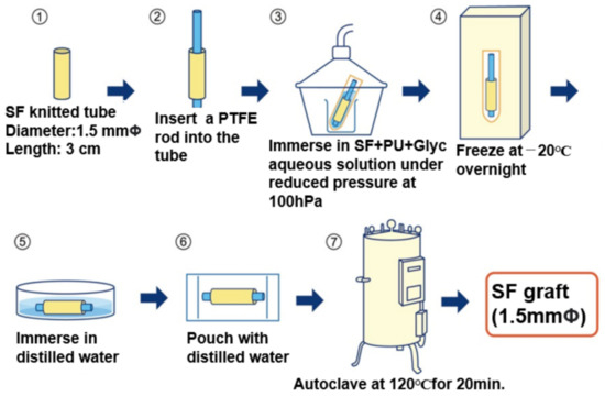 An SF-Glyc mixed aqueous solution (1:1 in w/w) was mixed with a water-dispersed biodegradable PU aqueous solution (SF/PU ratio: 1:1 in w/w). The preparation of the small-diameter SF vascular graft coated with the PU-SF sponge is summarized in Figure 2. The SF double-raschel knitted tube (base of the graft) of the SF threads with reduced amounts of SS was prepared using a computer-controlled double-raschel knitting machine (Fukui Wrap Knitting Co. Ltd., Fukui, Japan) [36,37]. Here, it was necessary to use such SF fibers with a small amount of SS to knit on the knit machine. ① The knitted silk tube was then degummed to remove the remaining SS completely. ② A PTFE rod with a 1.5 mm diameter was inserted in the SF tube with a 1.5 mm diameter. ③ The rod covered with the SF tube was immersed into a pipe filled with the mixed aqueous solutions of SF-PU-Glyc for coating. The pipe was placed in a desiccator, and then the desiccator interior was kept under a reduced pressure of 100 hPa until no air bubbles appeared from the coated surface of the SF tube. ④ After the treatment, the SF graft was frozen at −20 °C overnight. ⑤ and ⑥ Then, the graft was immersed in distilled water and bagged with distilled water. ⑦ The pouch SF graft in distilled water was sterilized in an autoclave at 120 °C for 20 min. For the preparation of SF vascular grafts coated with a water-dispersed PU sponge only, the preparation process was slightly different from the SF-PU-coated SF graft. That is, stages ① and ② are the same. Then, the rod covered with the SF tube was immersed into a pipe filled with the water-dispersed PU solution for coating in stage ③. Then, the PU-coated SF graft was freeze-dried after freezing the graft in liquid nitrogen. Finally, the graft was bagged with distilled water, and the pouch SF graft in distilled water was sterilized in an autoclave at 120 °C for 20 min [17,32]. The scanning electron microscopy (SEM; VE-7800 Keyence, Japan) was used to observe both the PU-SF composite sponge and the SF double-raschel knitted graft coated with the PU-SF composite sponge before implantation.