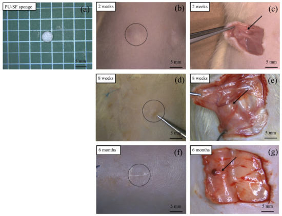 Photographs of the PU-SF sponge (a) before and (b,d,f) after implantation. Appearance image of the sponge embedding site 2 weeks after implantation (b) and appearance image from the inside after skin incision (c). Appearance image of the sponge embedding site 8 weeks after implantation (d) and appearance image from the inside after skin incision (e). Appearance image of the sponge embedding site 6 months after implantation (f) and appearance image from the inside after skin incision (g).