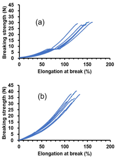 As mentioned in Materials and Methods, we used an SF double-raschel knitted tube with a 3.5 mm diameter for tensile testing. The tensile testing experiment was performed for the SF double-raschel knitted tube without coating and the SF double-raschel knitted tube with PU-SF composite sponge in the hydrated state. All of the data of the breaking strength (N) and elongation-at break (%) were listed in Table 3, and the stress-strain curves were obtained as shown in Figure 8a,b. The averaged values of the breaking strength (N) and elongation at break (%) were calculated to be (a) 29.1 ± 1.1 and 147 ± 11, and (b) 35.5 ± 3.8 and 120 ± 9, respectively. Namely, the breaking strength increases slightly, and elongation at break decreased slightly by SF-PU sponge coating, but the difference in the mechanical properties is relatively small. This is due to small amounts of coating PU-SF sponge covered the SF tubes. Actually, the values of thickness for SF knitted tubes without and with coating were 0.693 ± 0.025 mm and 0.693 ± 0.029 mm, respectively, which means exactly the same value with each other. In addition, as shown in Figure 7b, the space among woven silk fibers of the SF grafts was only lightly covered with the PU-SF composite sponge.