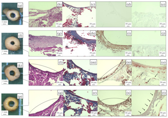The photographs of the microscopic findings and histological cross-section images of the PU- and PU-SF-coated SF grafts at 2 and 4 weeks after implantation are shown in Figure 11. The lumen diameter of the patented SF grafts did not change in any of the grafts, but narrowing was observed in the PU-coated SF graft at 4 weeks after implantation (Figure 11a,f,k,p). The H&E-stained images of the PU-SF-coated SF grafts at 2 weeks after implantation showed inflammatory cells, lymphocytes, macrophages, and neutrophils around and inside the grafts (Figure 11l). Those reactions were prominent on the outside of the grafts. On the other hand, in the PU-coated SF grafts, inflammatory cells were gathered on the outside like in the PU-SF-coated SF grafts but could not be confirmed on the inside of the grafts (Figure 11b). The MTC-stained images showed collagen fibers gathered throughout the PU-SF-coated SF grafts and infiltrated the interstices of the fibers of the base of the grafts (Figure 11m). In the PU-coated SF grafts, the collagen fibers were also gathered on the outside of the graft but hardly infiltrated into the inside of the graft (Figure 11c). The α-SMA-stained images showed that smooth muscle cells gathered mainly outside the PU-SF-coated SF grafts and along the luminal surface of the graft (Figure 11n). However, in the PU-coated SF grafts, smooth muscle cells could only be confirmed outside of the grafts (Figure 11d). The CD31-stained images showed that vascular endothelial cells were not detected in the luminal surfaces of the two types of grafts (Figure 11e,o). In the PU-SF-coated SF grafts, some blood vessels infiltrating the gaps in the base of the grafts could be confirmed (Figure 11o). In the PU-SF-coated SF grafts at 4 weeks after implantation, the number of inflammatory cells gathered on the outside of the grafts decreased (Figure 11q). In addition, the layered structure formed inside the grafts was confirmed more firmly, but the lumen was firmly secured and patent. In the PU-coated grafts, a large number of inflammatory cells were gathered on the inside of the grafts (Figure 11g). Collagen fibers had infiltrated the gaps in the base of the PU-SF-coated SF grafts, as they did 2 weeks after implantation (Figure 11r). In the PU-coated SF graft, collagen fibers were observed inside the graft 4 weeks after implantation, but not in the gap of the base of the graft (Figure 11h). Smooth muscle cells were similarly gathered inside of the graft in both SF grafts (Figure 11s,i). Endothelial cells could be confirmed in a part of the lumen surface of the implanted grafts, but they were not completely covered (Figure 11t). In the PU-coated SF grafts, vascular endothelial cells could not be confirmed as in the case at 2 weeks after implantation (Figure 11j).