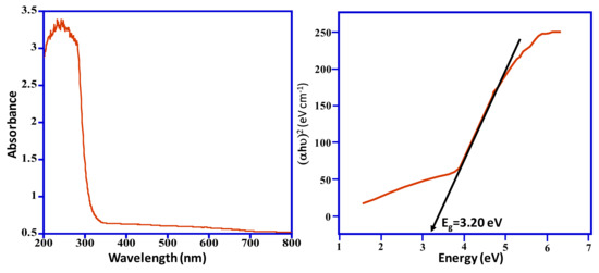 UV–Vis absorption and bandgap spectrum of the fabricated Mn3O4/ZnO/Eu2O3 photocatalyst.
