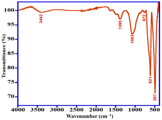 The FT-IR spectra were usually employed to identify the functional groups existing on the prepared photocatalyst surface. The FT-IR spectra of Mn3O4/ZnO/Eu2O3 were illustrated in Figure 2. The absorption band located at approximately 3442 cm−1 could be owing to (O–H) groups stretching vibrations of adsorbed H2O molecules, and the absorption peak at 1395 cm−1 belongs to (C–OH) stretching vibrations. Additionally, an absorption peak at nearly 1063 cm−1 is assigned to (C=O) stretching vibrations of acetate. The fingerprint peaks situated at 567 cm−1 and 621 cm−1 corresponding to (Zn–O) and (Zn–O–Zn) stretching vibrations, respectively. Finally, a peak situated at 872 cm−1 is associated with the stretching vibrations of (Zn–O).