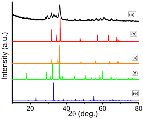XRD analysis of the synthesized Mn3O4/ZnO/Eu2O3 photocatalyst (a) and a comparative ZnO (b), Eu2O3 (c), Mn3O4 (d), Mn2O3 (e) diffraction patterns.