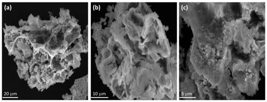 Morphological properties of the synthesized Mn3O4/ZnO/Eu2O3 photocatalyst are studied by FE-SEM analysis, and the results were illustrated in Figure 4a–c. Low magnification FE-SEM micrograph as displayed in Figure 4a,b reveals that the Mn3O4/ZnO/Eu2O3 is composed of clusters of flakes, in which all the flakes are interconnected and form a net-like structure with large pores (Figure 4c). According to the formerly reported studies, it can be said that the flakes could belong to the Mn3O4 NPs of the material, whilst the clusters could be the Eu2O3 and ZnO NPs in the synthesized nanocomposite [37].