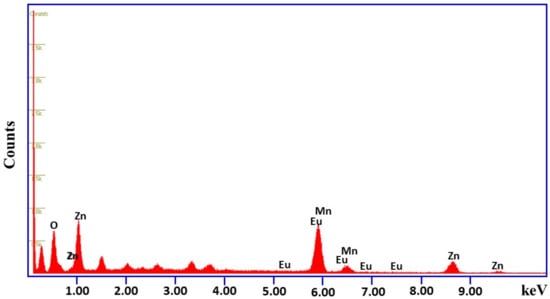 The elemental analyses of the fabricated Mn3O4/ZnO/Eu2O3 nanocomposite were scrutinized utilizing EDX analysis, as demonstrated in Figure 5, which displays that the synthesized material contains the expected elements, and are well-dispersed throughout the composition, which could be playing a synergetic role in enhancing the photocatalytic activity. Additionally, the energy-dispersive spectra of Mn3O4/ZnO/Eu2O3 nanocomposite indicate the existence of all the desired elements such as Mn, Eu, Zn and O as well as the percentage of elemental compositions, which is in accordance with the stoichiometric amounts used in the synthesis of the Mn3O4/ZnO/Eu2O3 nanocomposite.