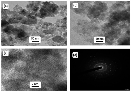The HRTEM analysis for the examination of the size and morphology of the prepared Mn3O4/ZnO/Eu2O3 nanocomposite at various magnifications is displayed in Figure 6. Figure 6a–c shows the TEM images with varying magnifications, which demonstrate that the spherical morphology particles are uniformly dispersed throughout the material as well as some aggregations can be noticed. The particles sizes are in the range of 20–60 nm. The SAED pattern (Figure 6d) shows the polycrystalline form of the sample, and the reflection planes obtained are in high accordance with the results concluded from the XRD analysis.