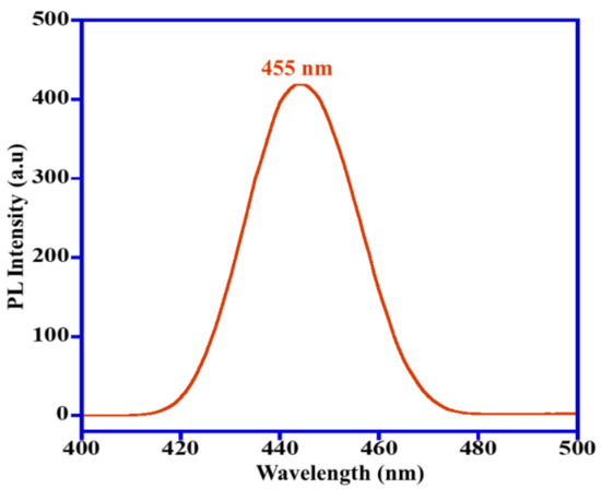 At a period of 10 min, 2 mL of the sample was injected in a photoluminescence instrument, which displayed the presence of a photoluminescent peak at 455 nm (Figure 7), indicating the generation of OH• radicals, a pivotal chemical species for the decomposition of deleterious dyes [15]. Therefore, it can be concluded that photodegradation of MB and MO dye occurs by a free radical mechanism over Mn3O4/ZnO/Eu2O3 photocatalyst. A possible mechanism of photocatalytic degradation is described in Scheme 2.