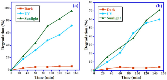 Influence of light source on photodecomposition of (a) MB and (b) MO.