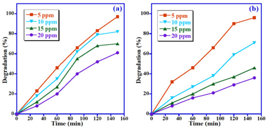The effect of initial concentrations of MB and MO dyes on the photodegradation efficiency of the studied dyes was also investigated by varying the concentration of dye from 5 to 20 ppm under visible light while keeping the photocatalyst dose of 15 mg unchanged at pH 7. The photocatalytic data were graphically illustrated in Figure 9. For MB dye, the photocatalytic data reveal that the removal efficacy of the Mn3O4/ZnO/Eu2O3 photocatalyst is inversely proportional to the MB concentration under identical conditions, i.e., the highest degradation was detected at the lowest dye concentration (5 ppm). By raising the MB concentration from 5 to 20 ppm, the photodegradation efficiency of MB declined from 97% to 61%, as displayed in Figure 9a. The same trend occurs in the case of MO dye, in which the photodegradation efficiency of MO reduced from 96% to 36% when the concentration of MO dye raised from 5 to 20 ppm (Figure 9b). This could be owing to the fact that the photocatalytically active sites may be covered with dyes and decrease light absorption on the photocatalyst surface at higher dye concentrations, which leads to reducing the formation of hydroxyl radicals, therefore decreasing degradation efficiency. In contrast, photons readily reach the photocatalyst surface at lower dye concentrations, and the generation of hydroxyl radical ions will be easier [40]. Hence, it is necessary to increase the photocatalyst amount as the concentration of dyes increases.