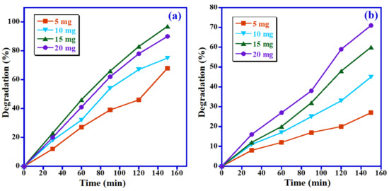Influence of catalyst quantity on photodecomposition of (a) MB and (b) MO.