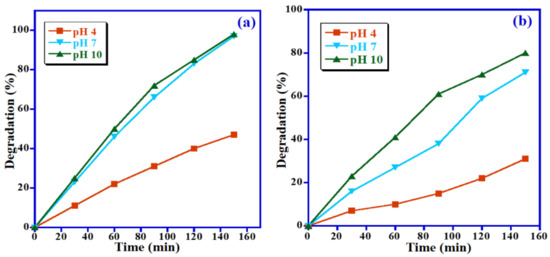 Impact of pH value on the photocatalytic degradation of (a) MB and (b) MO.