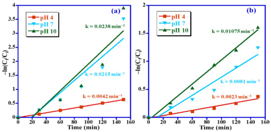 where Cf and Ci are the final concentration at time t and initial concentration, correspondingly, and k is the first order rate constant. MB degradation rate constants of 0.0042, 0.0215 and 0.0238 min−1 were achieved for the pH 4, pH 7 and pH 10, respectively (Figure 12a), whereas the MO degradation rate constants of 0.0023 min−1, 0.0081 min−1 and 0.01075 min−1 were obtained for pH = 4, 7 and 10, respectively (Figure 12b).