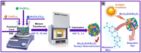 (A) Schematic diagram of fabrication of Mn3O4/ZnO/Eu2O3 nanocomposites. (B) Scheme presenting the photodegradation of MB dye.
